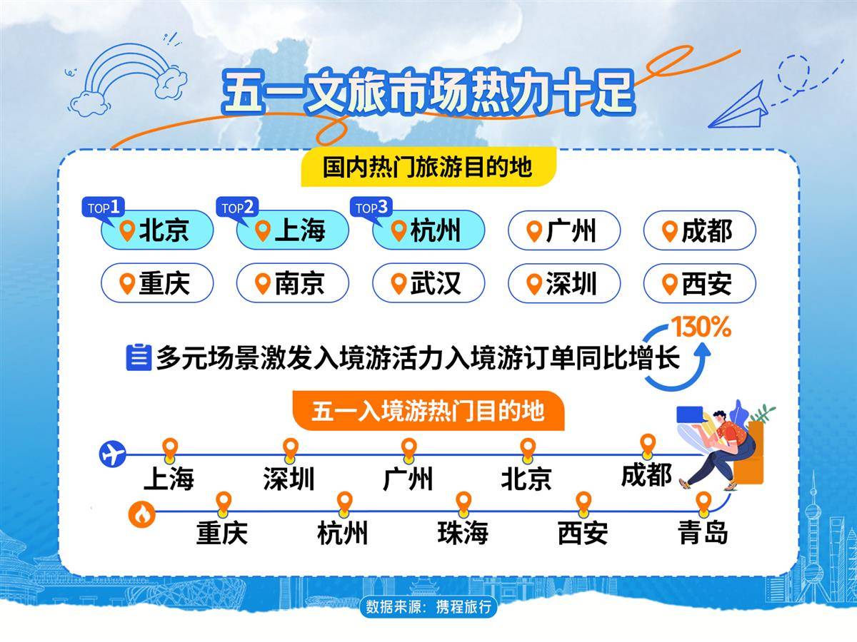 湖北日报讯(记者王理略、通讯员张大伟)5月5日,记者从携程获悉,今年五一假期,国内文旅市场强势复苏,呈现“多点开花”态势。国内多地文旅火力全开解锁超燃玩法,多地迎来大批客流。数据显示,假期里湖北入境游订单量同比去年增长63%。武汉位列国内热门旅游目的地前十。