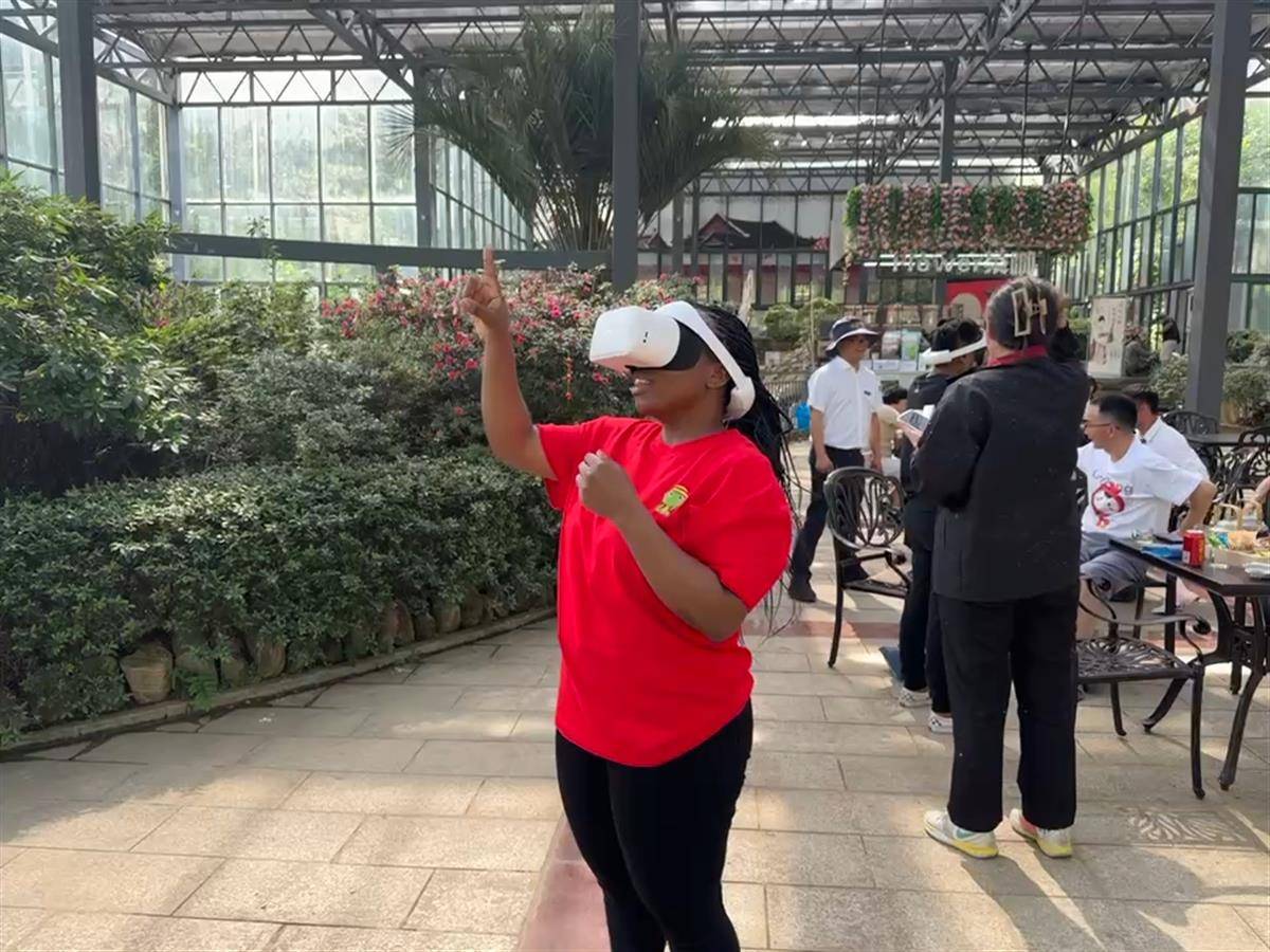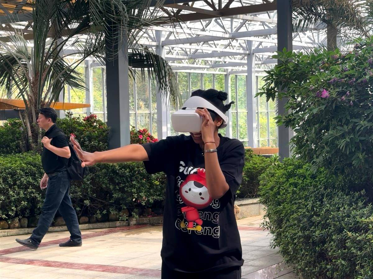 旅程最后,南非游客在杜鹃博览园VR体验馆开启360度全景环绕太空漫步。逼真的场景让游客身临其境,游客安娜赞叹:“仿佛真的来到了太空,这种体验太震撼了!”