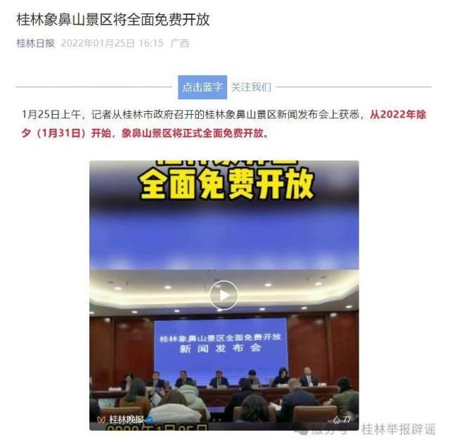 近日,有网民在某网络平台上发帖称“目前,桂林象山公园实行分时段计费制度。根据不同时间段游览所需花费也有所不同”。经桂林举报辟谣平台核实,此为不实信息。