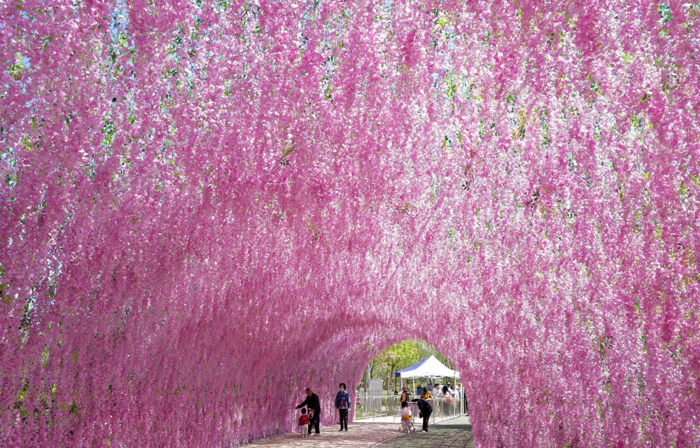 5月1日,游客在位于银川市的中国花卉博览园游玩。新华社记者 王鹏 摄