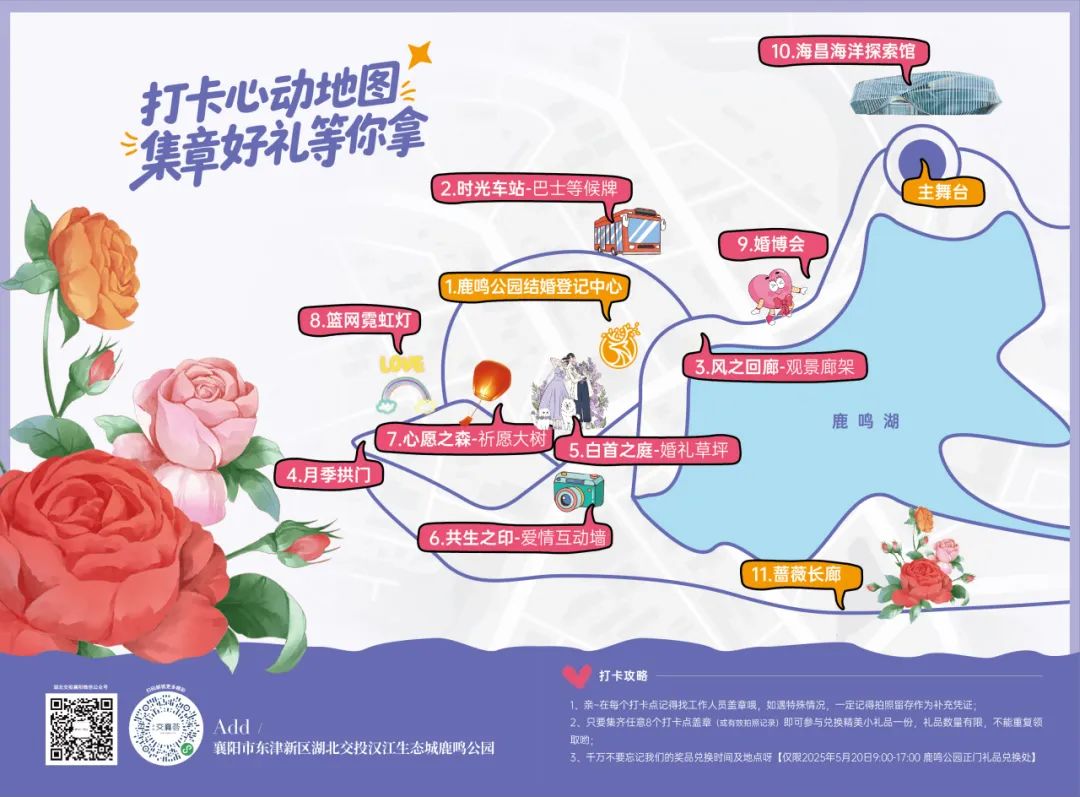 打卡说明:沿11个浪漫爱情主题打卡点(如时光车站、白首之庭、心愿之森等)集章,集满任意8个即可在520当天前往兑奖点领取精美礼品!礼品数量有限,送完即止。