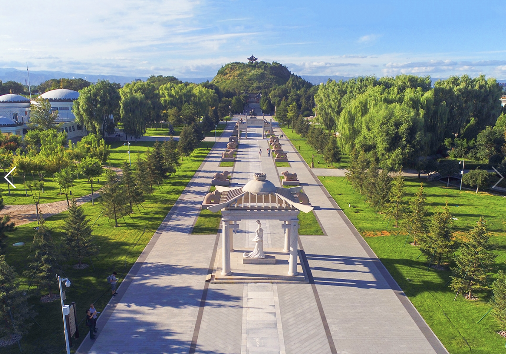 从主体建筑出来,首先映入眼帘的是中轴线上笔直的神道。神道及陵寝建筑群是我国古代丧葬礼仪制度中不可或缺的部分,是显示墓主不同身份等级地位的重要标志。昭君墓神道全长约400米、宽6米。神道两侧列置的石刻群既是墓葬的标志,也象征着威仪吉祥、驱灾避祸。昭君墓园共有石像生6对12尊。再外侧有四组对称性的建筑:东侧是数字5D影院和昭君故里纪念馆。西侧是中国古代和亲文化馆和单于大帐。东侧是中原农耕民族典型的砖木结构建筑,西侧则是北方游牧民族典型的穹庐式建筑。各展千秋,交相辉映。