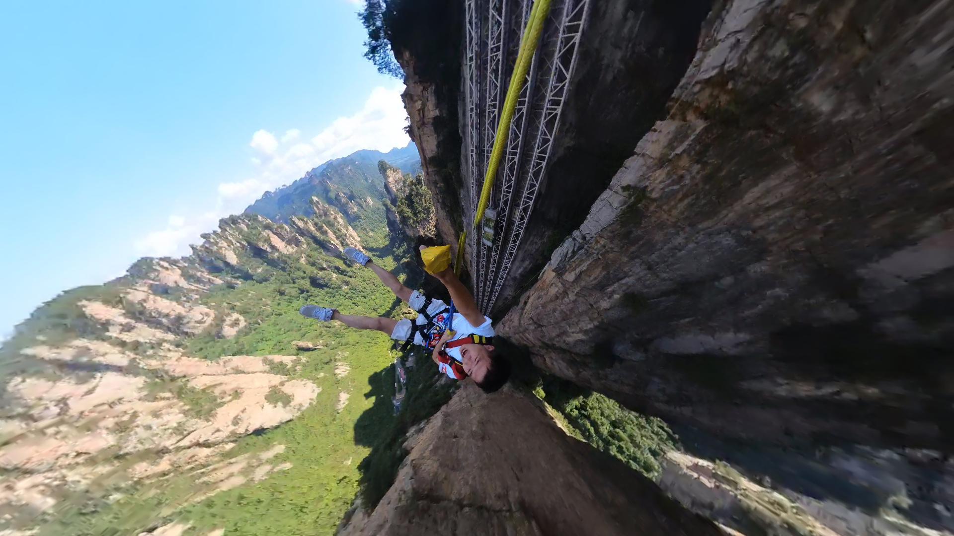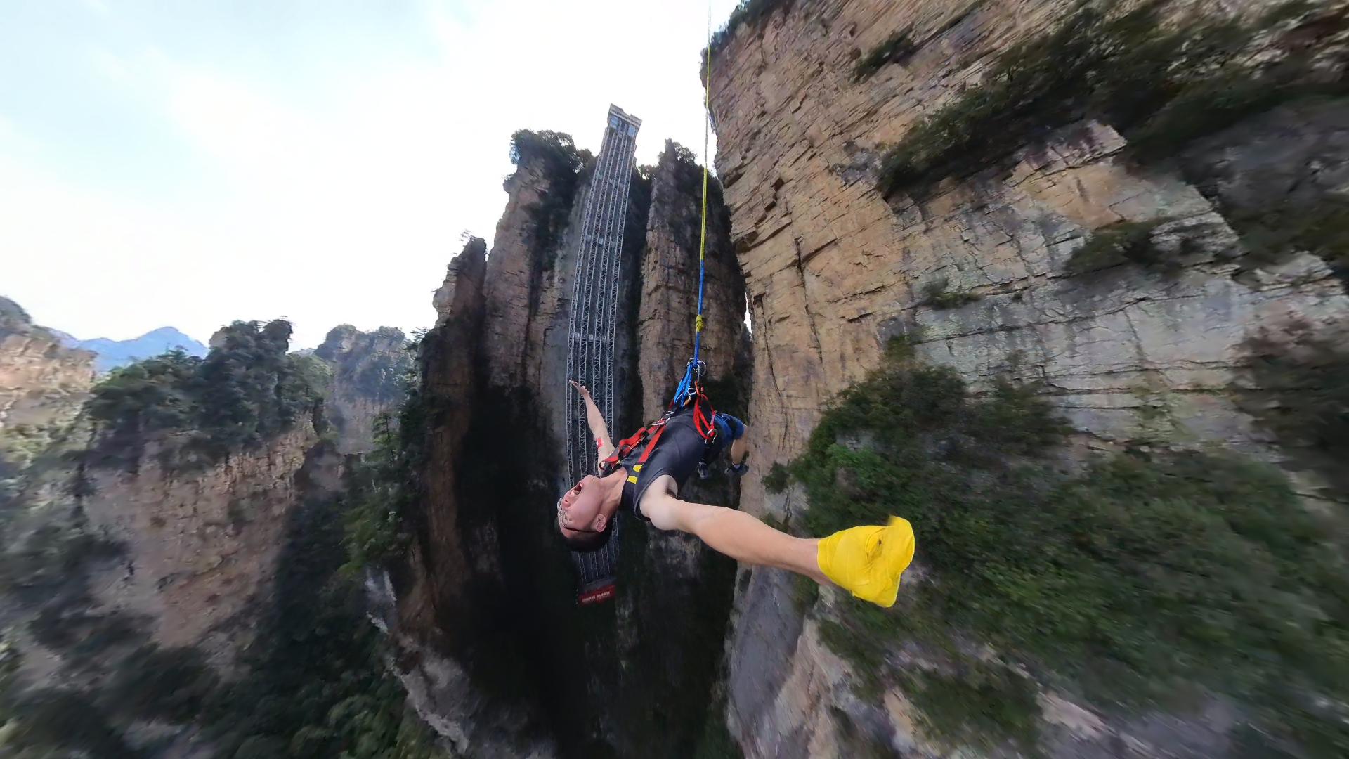 据介绍,荡绳直线跨度691米,垂直高差335米,从起跳点放眼望去,对面是张家界国家森林公园著名景点将军列阵和神兵聚会。通过无人机视角,险峭的峰林、镶嵌在悬崖边的田园、峡谷尽收眼底,壮美如画。