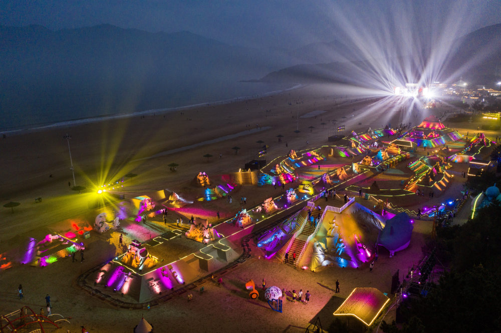 灯光映照下的第二十六届中国舟山国际沙雕节展区(5月17日摄,无人机照片)。新华社记者 徐昱 摄
