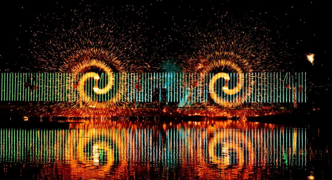 梦幻花灯,有趣的灯组亮相!超大火凤凰腾空翱翔,漫天金光如神迹降临,气球在空中绽放粉色花瓣,浪漫值直接拉满。