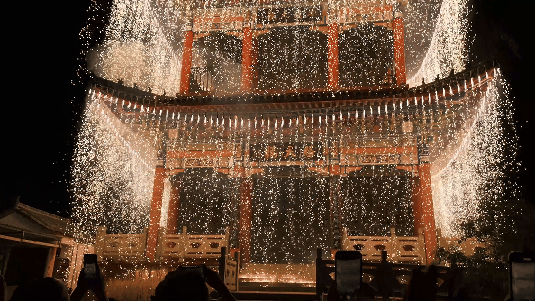木兰胜天的中式冷焰瀑布,夜空中最美的瞬间一定要记录下来,篝火晚会热闹开场,围着篝火尽情狂欢。