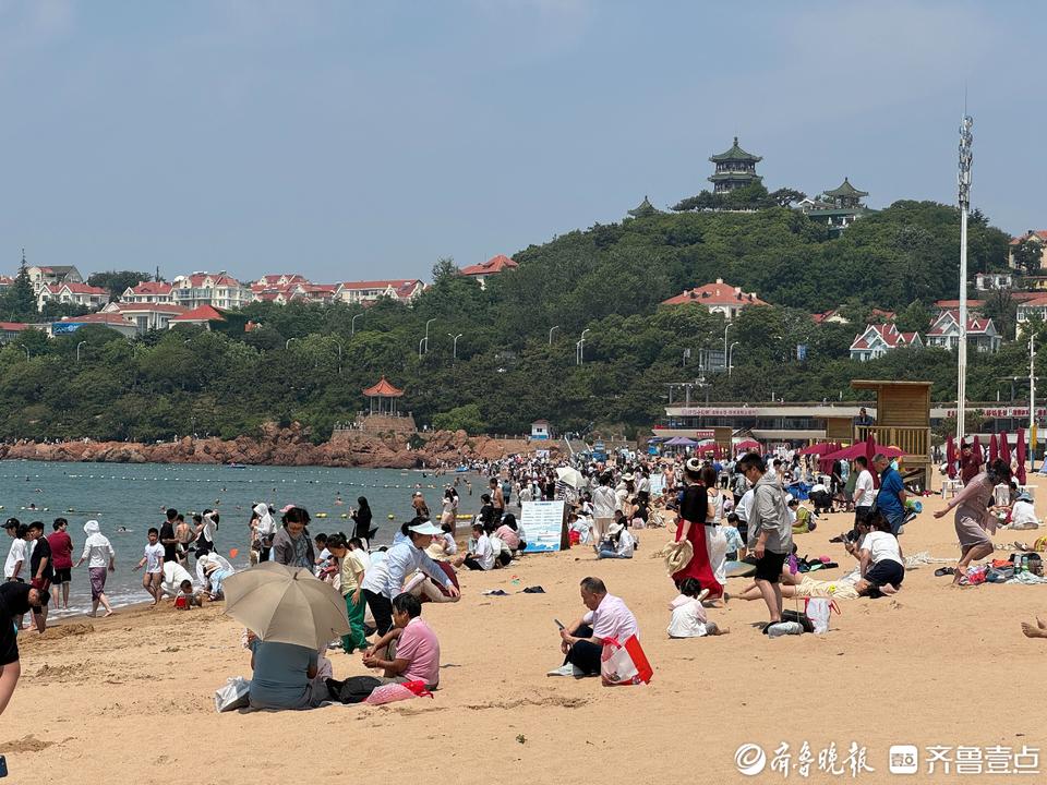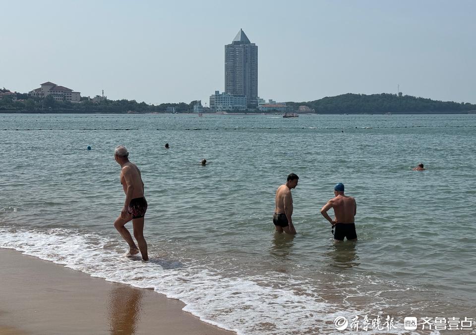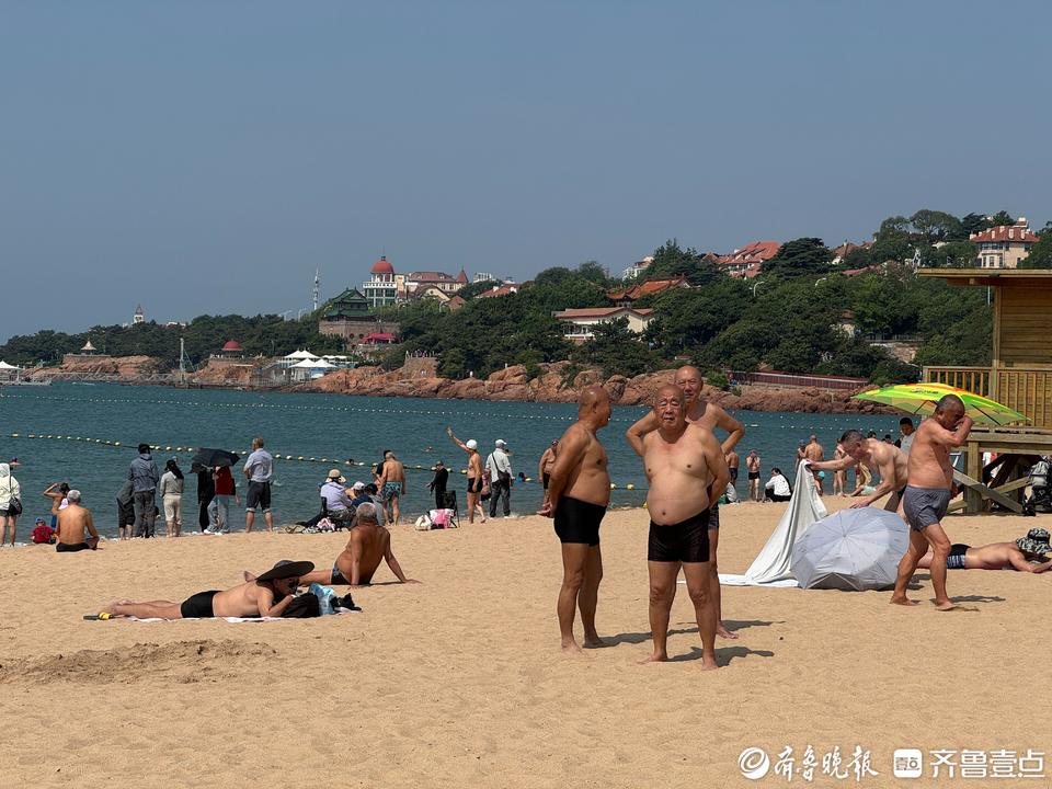 在沙滩上,迫不及待洗海澡的青岛“巧克力”大爷格外醒目。“青岛海水清澈,沙滩柔软,都快来游泳吧!”78岁的宋大爷和好友相约,一早就来到青岛第一海水浴场集合,强身健体。青岛充满魅力的海边风景也让外地游客慕名而来,来自哈尔滨的张女士和女儿换上了适合在海边拍照的衣裙,用相机记录下这美好时刻。“我是第一次来青岛,海边真的太美了,我和女儿都很享受这个假期。”张女士说。6月1日恰逢“六一”国际儿童节,海边也有不少家长带着孩子来共享亲子时光。