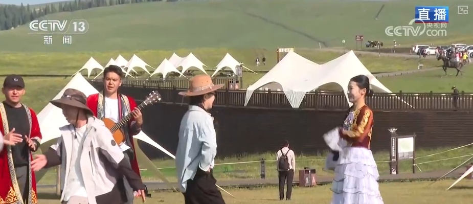 除了优美的自然风光,在这里还可以感受到当地哈萨克族的传统文化魅力。当地的表演团队正在跳哈萨克族舞蹈“黑走马”,舞者们身着色彩鲜艳的民族服饰翩翩起舞,将草原民族的豪迈奔放和灵动洒脱展现得淋漓尽致,不少游客也加入进来,大家随着音乐的节拍尽情舞动,感受草原文化的魅力。游客们在这里还可以品尝地道的特色美食,像浓郁醇厚的奶茶、具有新疆特色的馕等。