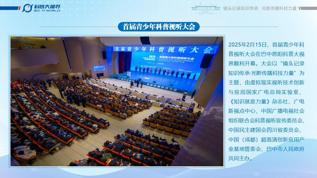 科普大视界的活力更体现在持续不断的创新活动中。科普大视界执行运营总监尹雅楠介绍,今年2月在此举行的首届青少年科普视听大会,以“镜头记录知识传承,光影传播科技力量”为主题,围绕航空航天、大国重器、工业智造、历史科考等十大前沿主题,通过虚拟现实、超高清影像和人工智能等技术,将科学知识转化为可触可感的科普视听盛宴。活动期间,10名院士围绕解密宇宙奥秘、中国高铁的创新与发展等主旨开讲,200余名科学家开展主题讲座,还有多位科学家深入巴中校园开展“开学第一课”。大会的成功举办,极大地激发了青少年的科技创新热情,也让科普大视界声名远扬。