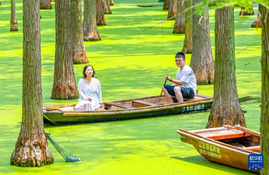 7月6日,游客在江苏省扬州市江都区渌洋湖湿地公园“水上森林”划船游玩。