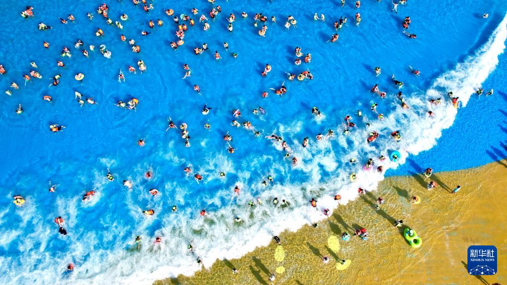 7月5日,浙江省湖州市长兴县太湖图影旅游度假区龙之梦乐园嬉水世界,游客亲水消暑(无人机照片)。