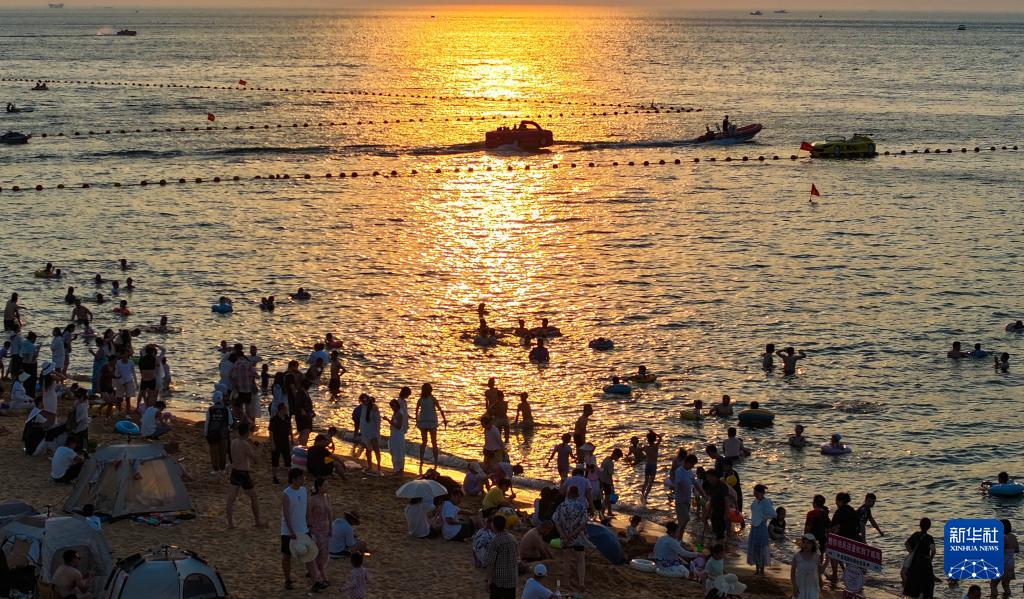 7月5日,游客在山东省威海市国际海水浴场亲水消暑(无人机照片)。