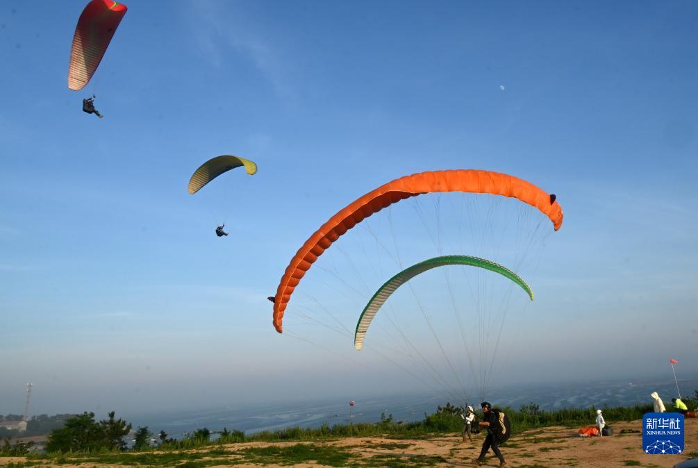 7月5日,游客在山东省荣成市爱伦湾海滨体验滑翔伞运动。