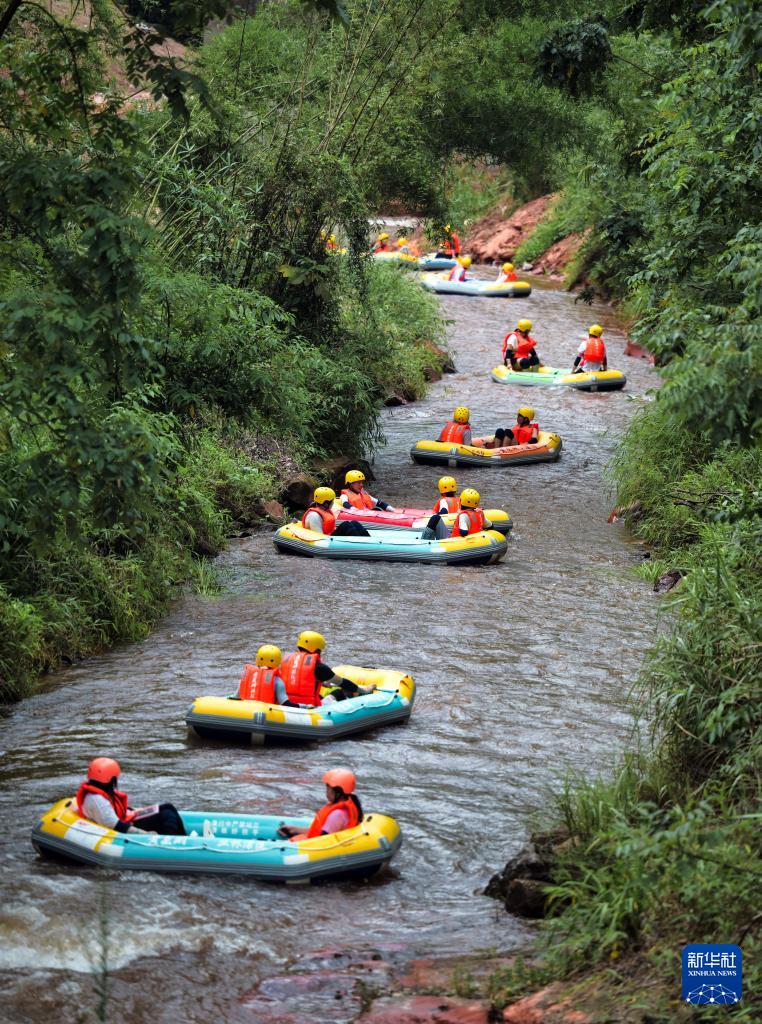 7月5日,四川省泸州市纳溪区黄龙湖景区,游客在丛林河流上漂流。