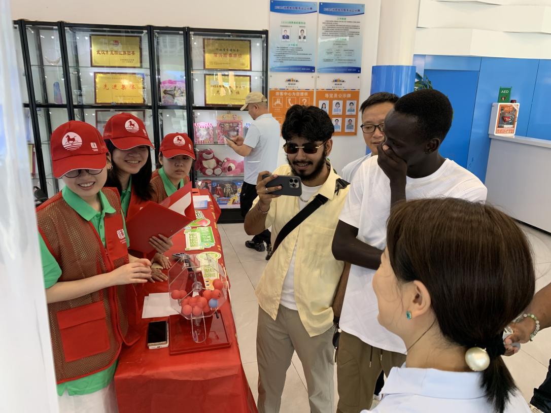 活动吸引过往游客驻足,中国地质大学的巴基斯坦、非洲留学生,以及本地银发旅游爱好者纷纷加入。武汉文旅志愿者采用“中英双语+方言解读”模式,针对国际游客重点讲解合同规范与紧急求助途径,对老年群体则通过图文手册和口头叮嘱等强化“警惕低价陷阱”的意识。