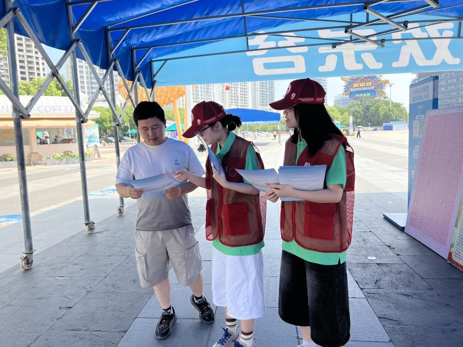 志愿者向游客发放《警惕“不合理低价游” 守护美好旅程》宣传手册,图文并茂揭示“零负团费”“强制购物”等典型套路,为游客提供实用避险锦囊,使其面对诱惑时能擦亮双眼,自觉抵制不合理低价游产品。