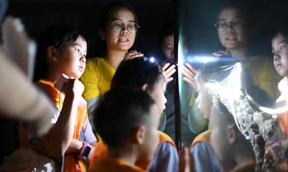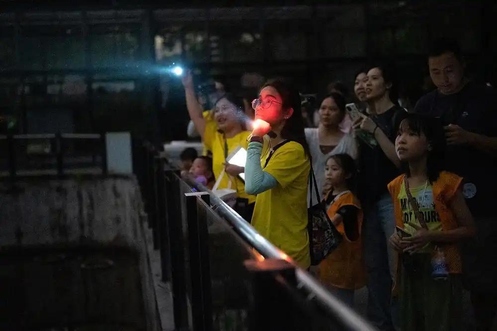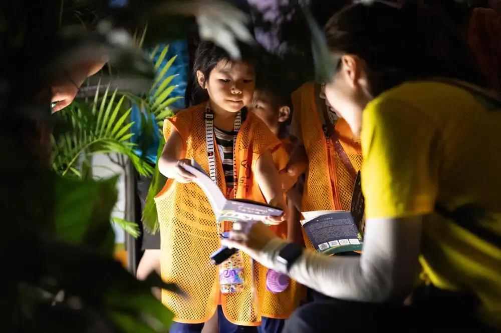 “大家发现‘爬行界大熊猫’瑶山鳄蜥了吗?”在科普导师压低的声音引导下,亲子家庭们屏息凝神,凭借手电筒的微光,在展缸的溪流岩石中仔细搜寻。“这份静谧,是白日游园无法触及的神秘!”一位成员悄声道。