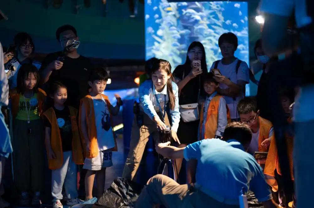 这是7月10日深夜发生在广州海洋馆巨大观景窗前的一幕:在枕着海底微光和游鱼入眠前,孩子们悄悄许下一个个纯真的心愿。而这场由广州动物园与广州海洋馆联手打造的首期“海陆空一夜营”,通过“晨观鸟、夜观虫、梦游海”的多维活动,正式拉开了暑期探秘“你没见过的动物王国”的奇幻旅程。