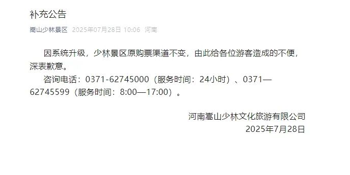 因系统升级,少林景区原购票渠道不变,由此给各位游客造成的不便,深表歉意。