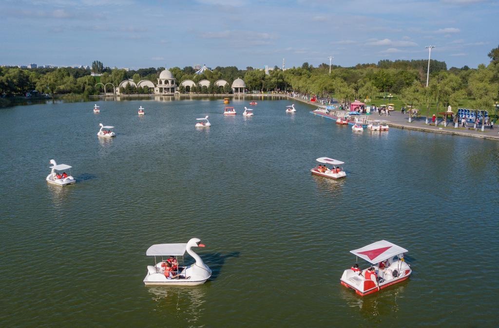 游人在太阳岛风景区太阳湖上乘船游览(无人机照片)。 新华社记者 王建威 摄