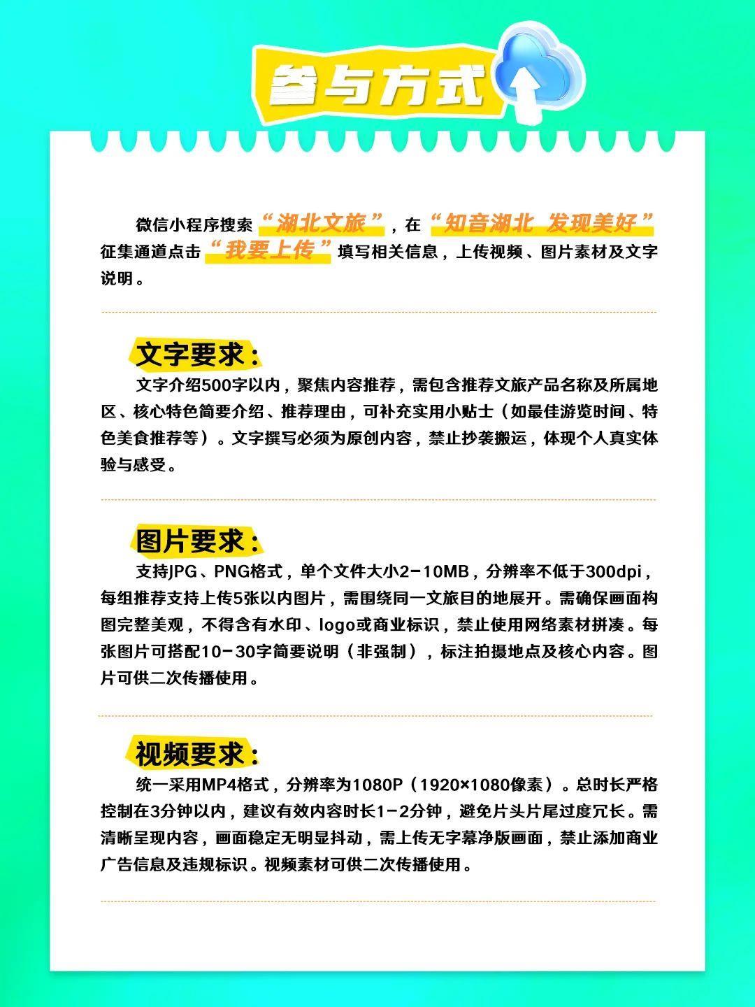 湖北省文旅厅诚邀各级文旅部门、广大企业、游客、网友共赴这场荆楚之约、发现之约,通过“湖北文旅”微信小程序热情参与。你的一次分享,或许就是湖北文旅的下一个传奇。