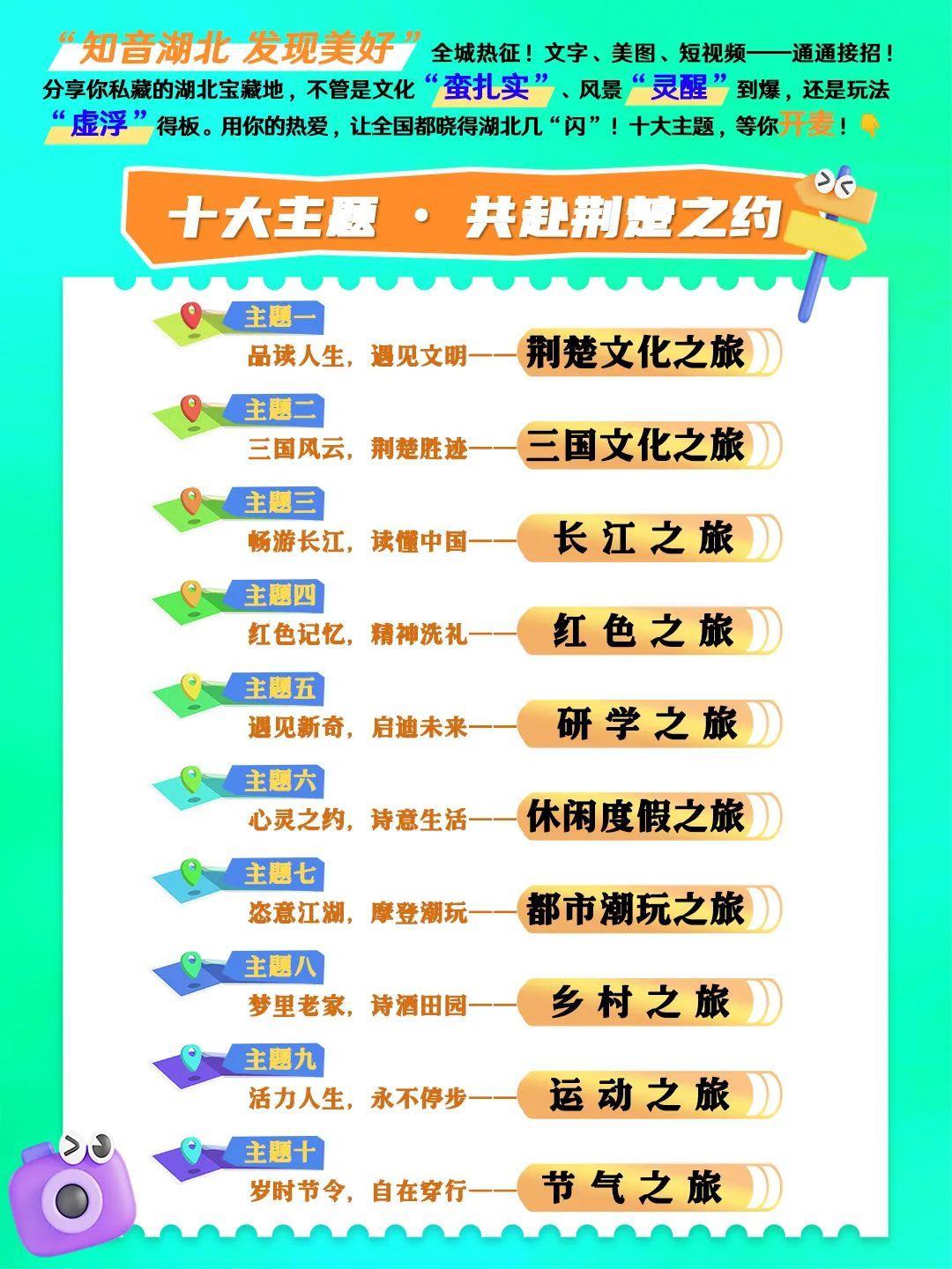 活动精心设计十大文旅主题,涵盖了荆楚文化、休闲度假、都市潮玩、诗酒田园、运动休闲、岁时节令等类别,全方位发掘展示荆楚大地的自然禀赋与厚重人文,展示现代生活方式和“文旅+”“+文旅”新业态、新场景、新产品,让每一位参与者都能触摸到湖北文旅最鲜明的精神标识与最动人的气质内涵。