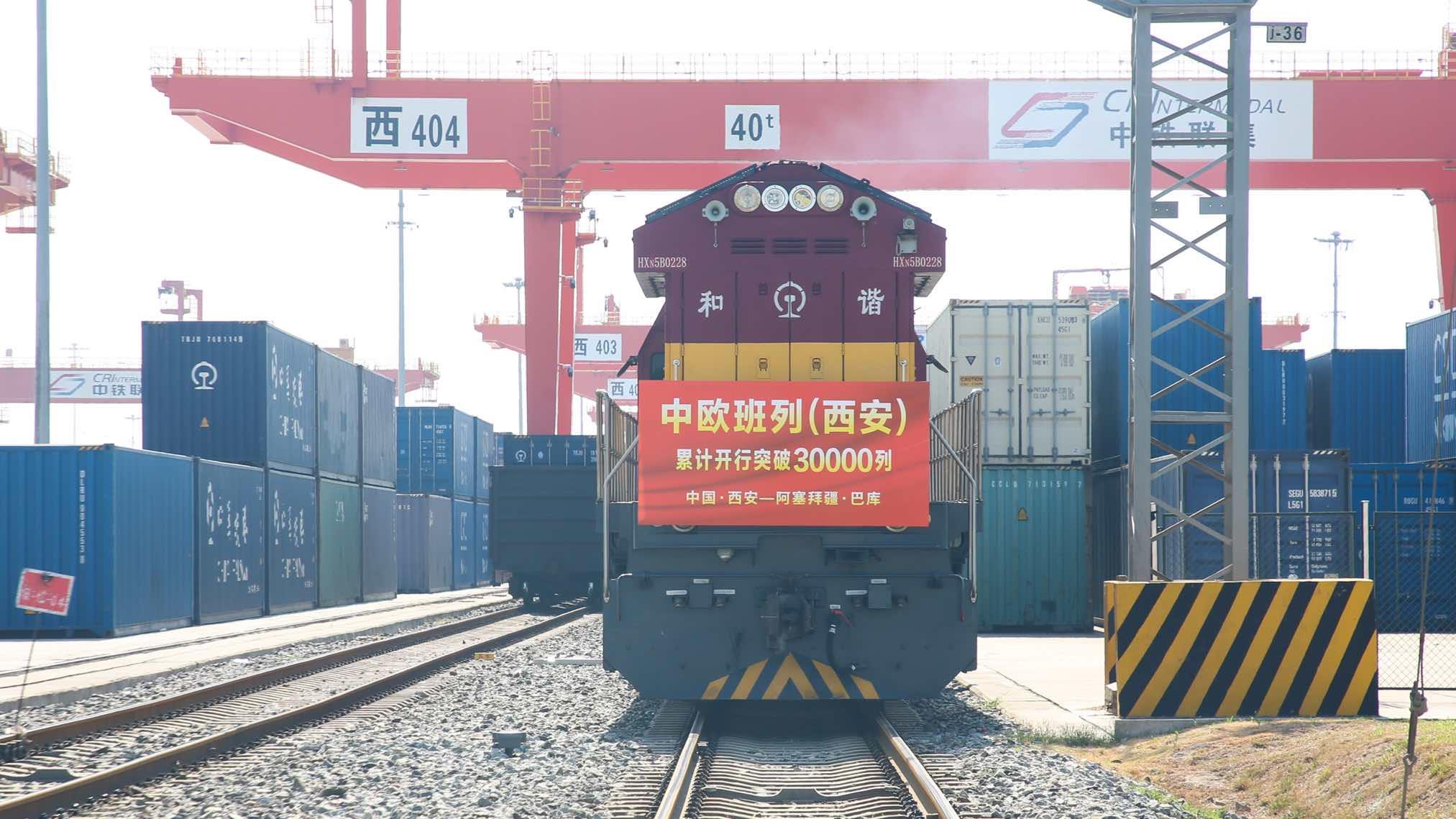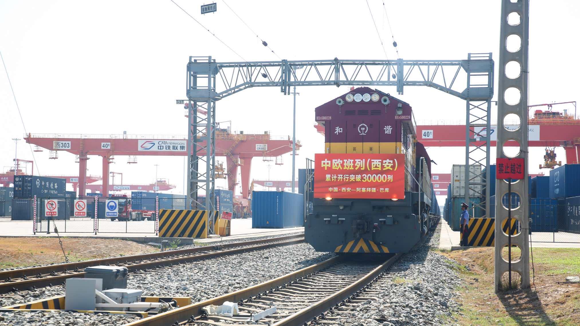 8月13日9时50分,满载着55个集装箱光伏组件的中欧班列(西安)从西安国际港站缓缓驶出,一路向西经霍尔果斯口岸出境,穿越哈萨克斯坦全境、跨里海,开往阿塞拜疆巴库,标志着中欧班列(西安)自2013年开行首列以来累计开行突破3万列,开行总量超过全国中欧班列累计开行总量的四分之一。