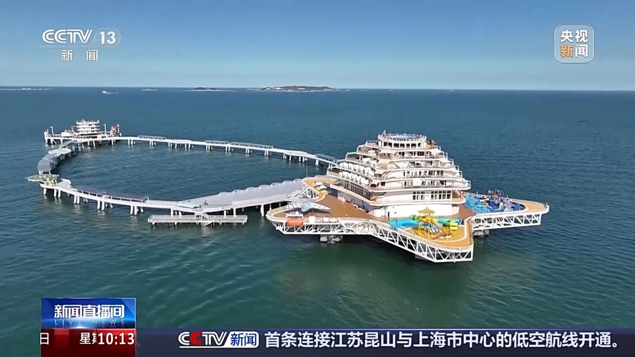 在山东烟台,“耕海1号”海洋牧场综合体平台上。5D球幕电影让人身临其境投入海洋怀抱,孩子们可以在长长的通道里,与海洋生物互动,喂小鱼、摸海星,走进这里,就像走进了一个蓝色海洋的传说。