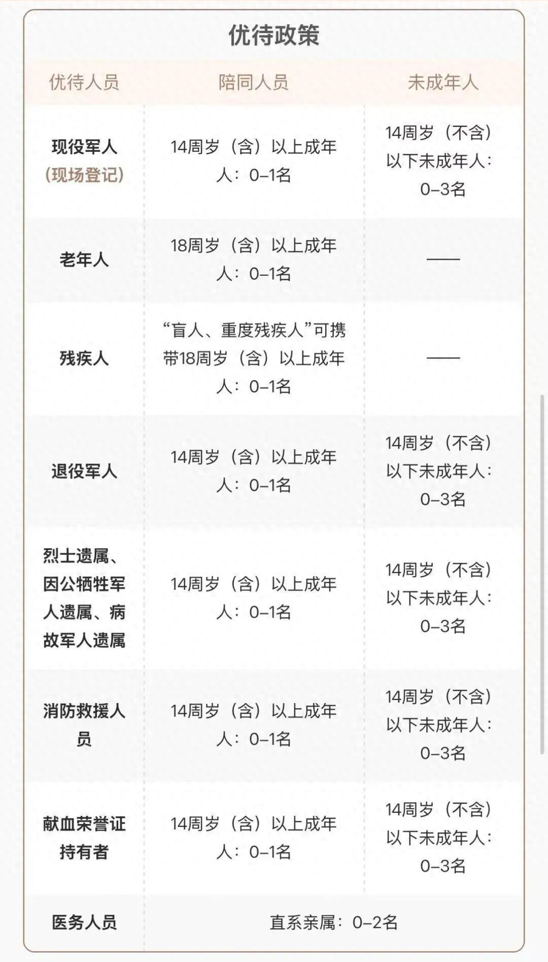 优待及陪同人员政策一览表