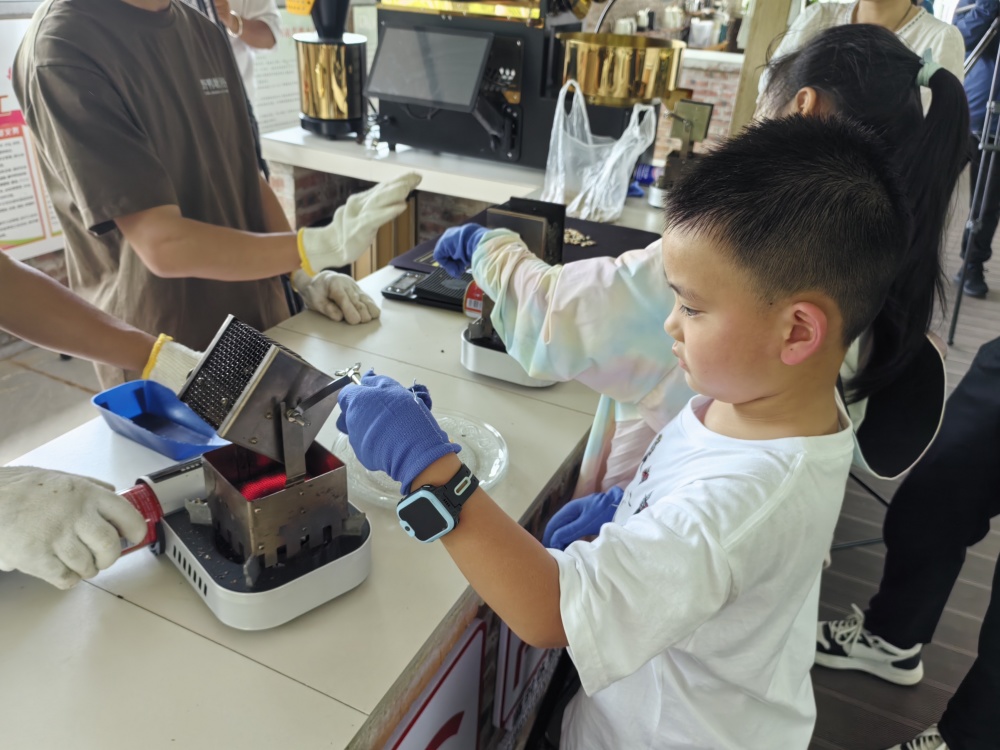 在野鸭塘河谷咖啡庄园,小朋友在咖啡师的指导下,体验制作手冲咖啡。新华社记者 荆昭延 摄