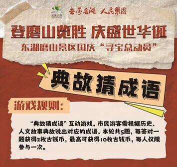 10月1日至3日,每天10:00—17:00,精彩活动持续上演。在磨山南门扫码关注“东湖磨山景区”微信公众号,即能领取专属游戏钱袋和活动任务卡。拿着任务卡,前往景区内4个游戏点位,寻找身穿楚服的NPC挑战互动游戏,每个游戏凭任务卡仅限参与1次。