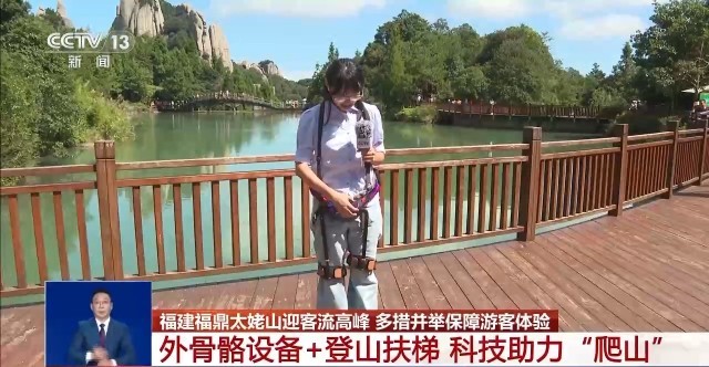 总台记者彭雨佳:太姥山是典型的山岳型景点,这里的垂直落差达到了900米,在山间分布着3600多级的台阶。今年景区引入了外骨骼登山设备,它可以根据游客的身高体重进行调节,来提供额外的助力。穿戴上设备爬山,会感觉有一股外力拉着大腿往上抬,就像开了“外挂”一样,能帮助游客轻松登山,租赁一小时的价格是30块钱。