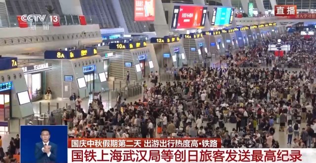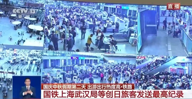 总台央视记者陈俏:从国铁集团今天发布的数据看,今年国庆、中秋假期首日,包括国铁上海局和国铁广州局等,全国部分重点地区的铁路客运,都刷新了单日旅客发送的历史纪录。