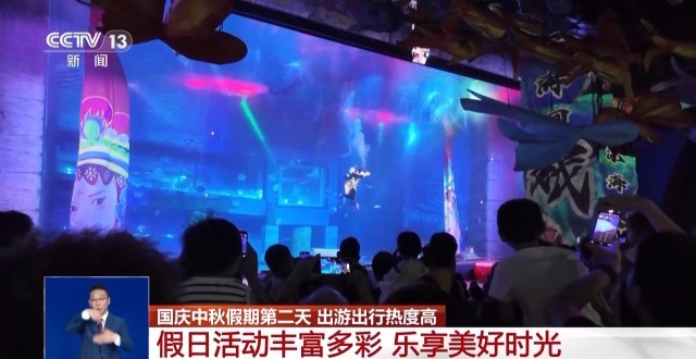 在广州这个海洋馆,海底中国戏在国庆期间连番上演。巨大的海底展缸中,随着传统戏曲背景音乐响起,舞者身着完整的刀马旦戏服,挥动的花枪在水下进行表演,以别样的方式让游客感受奇幻与东方艺术结合的魅力。