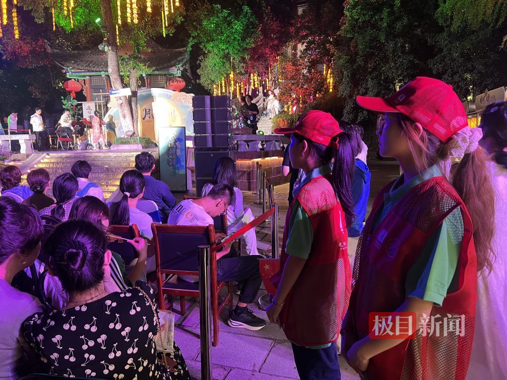随着傍晚7点30分诗会临近开场,游客市民陆续入场,志愿者们立刻忙碌起来:有的站在入口处引导有序检票,有的穿梭在观众席间耐心解答询问,有的提醒小朋友不要攀爬,以免摔伤。遇到外地游客,她们还主动推荐武汉的特色玩法。