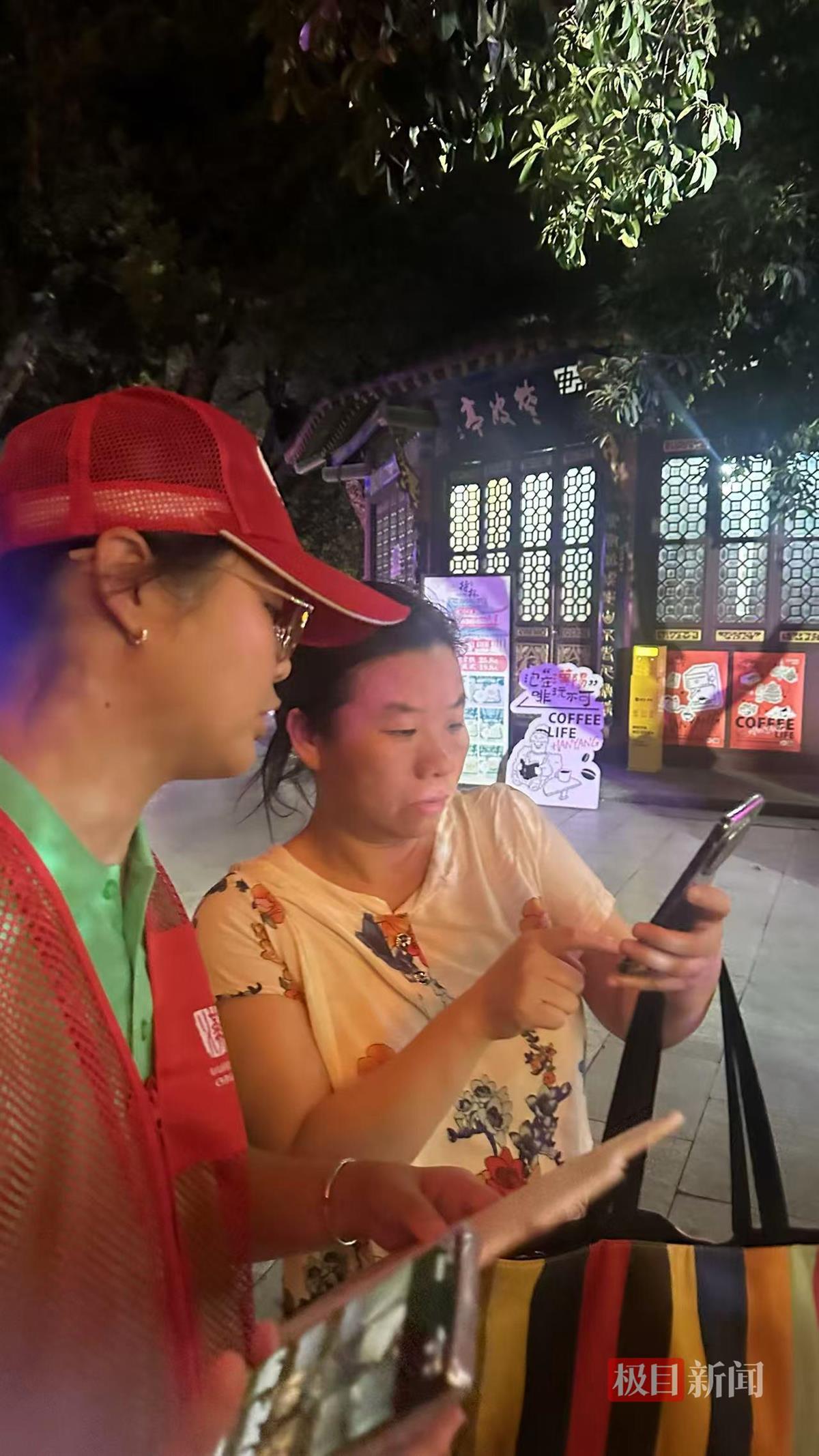 月色皎洁,晴川阁与灯光相映成趣,不少观众想定格这份美好,志愿者们又贴心变身“摄影师”,为他们留下这难忘的瞬间。不少游客还主动拉着志愿者一起合影。