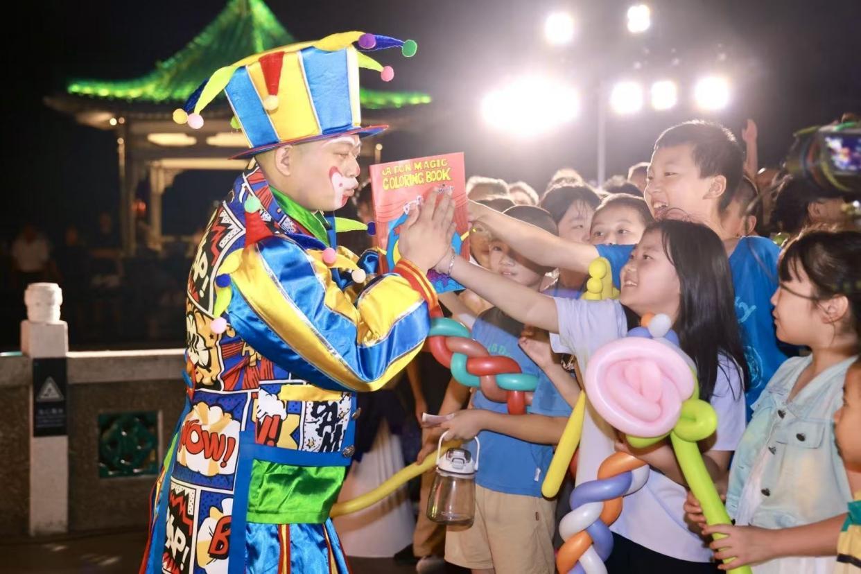 游客庞先生把拍到的现场视频分享到了家人群,“家里还有人在外地不能来,但我可以将这片美景拍下来发给他们看,把我的祝福送过去。” 晚会现场,不少游客一边品尝月饼,一边欣赏节目,孩子们则被趣味十足的小丑和魔术逗得笑声不断,场面一片温馨。
