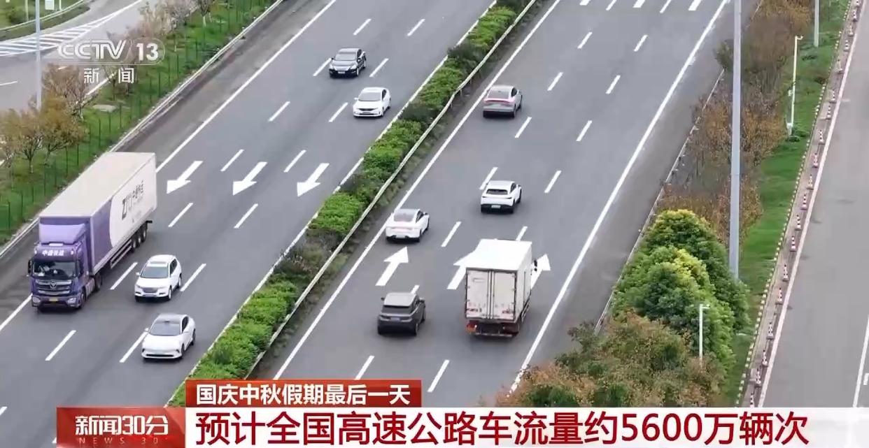 假期最后一天,全国公路路网流量以中长途返程和部分短途返程车流为主,车流量较昨日有所回落,预计全国高速公路车流量约5600万辆次。