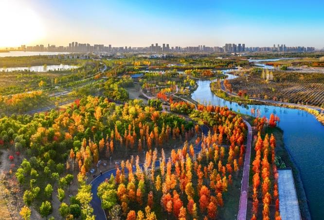 鱼梁洲中央生态公园在秋风中化身为色彩斑斓的童话世界。从高空俯瞰,宛如一幅美丽的油画。每年此时,公园内枫树叶由绿转黄再变红,似调色盘上的绚丽色彩,层层叠叠,错落有致。阳光透过叶缝洒下斑驳光影,为深秋午后增添了温暖与诗意。襄阳古城护城河畔层林尽染,古城、护城河、彩林、步道、城市相映成景,宛如美丽的油彩画,吸引了不少市民和游客前来打卡游玩。