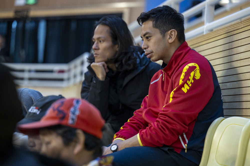 10月24日,在湖北省十堰市武当国际武术交流中心,美国“90后”路易斯(右一)在观看太极比赛。新华社记者 伍志尊 摄