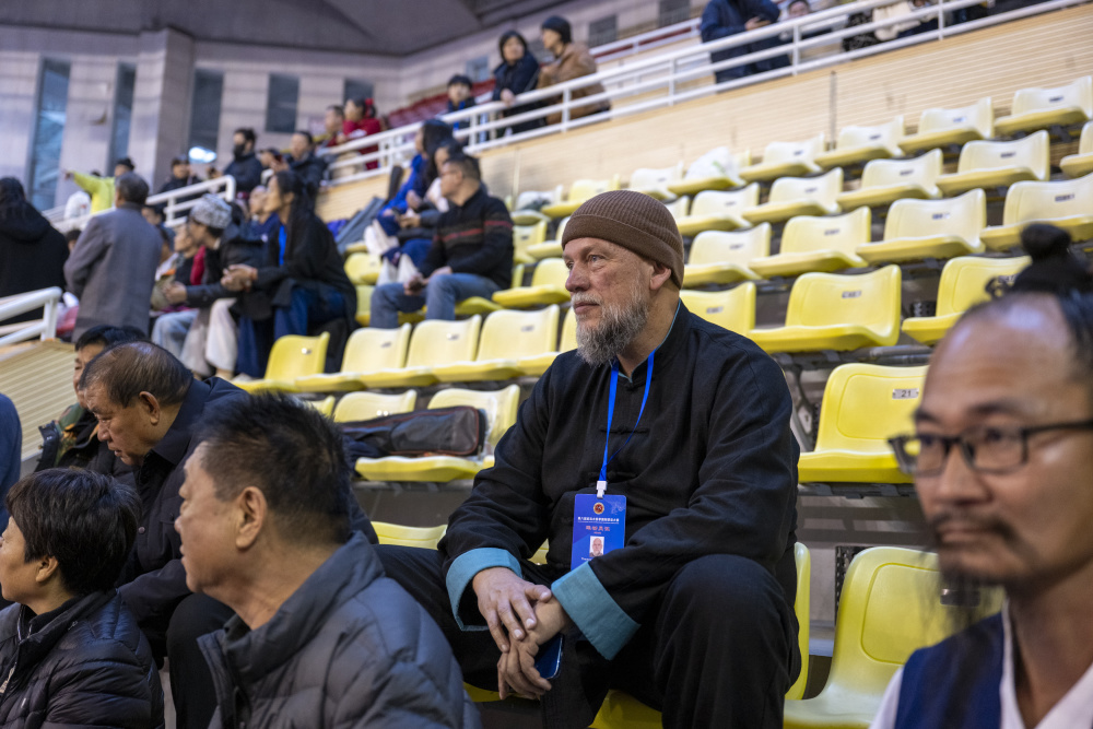 10月24日,在湖北省十堰市武当国际武术交流中心,53岁的德国工程师托马斯(右二)在观看太极比赛。新华社记者 伍志尊 摄