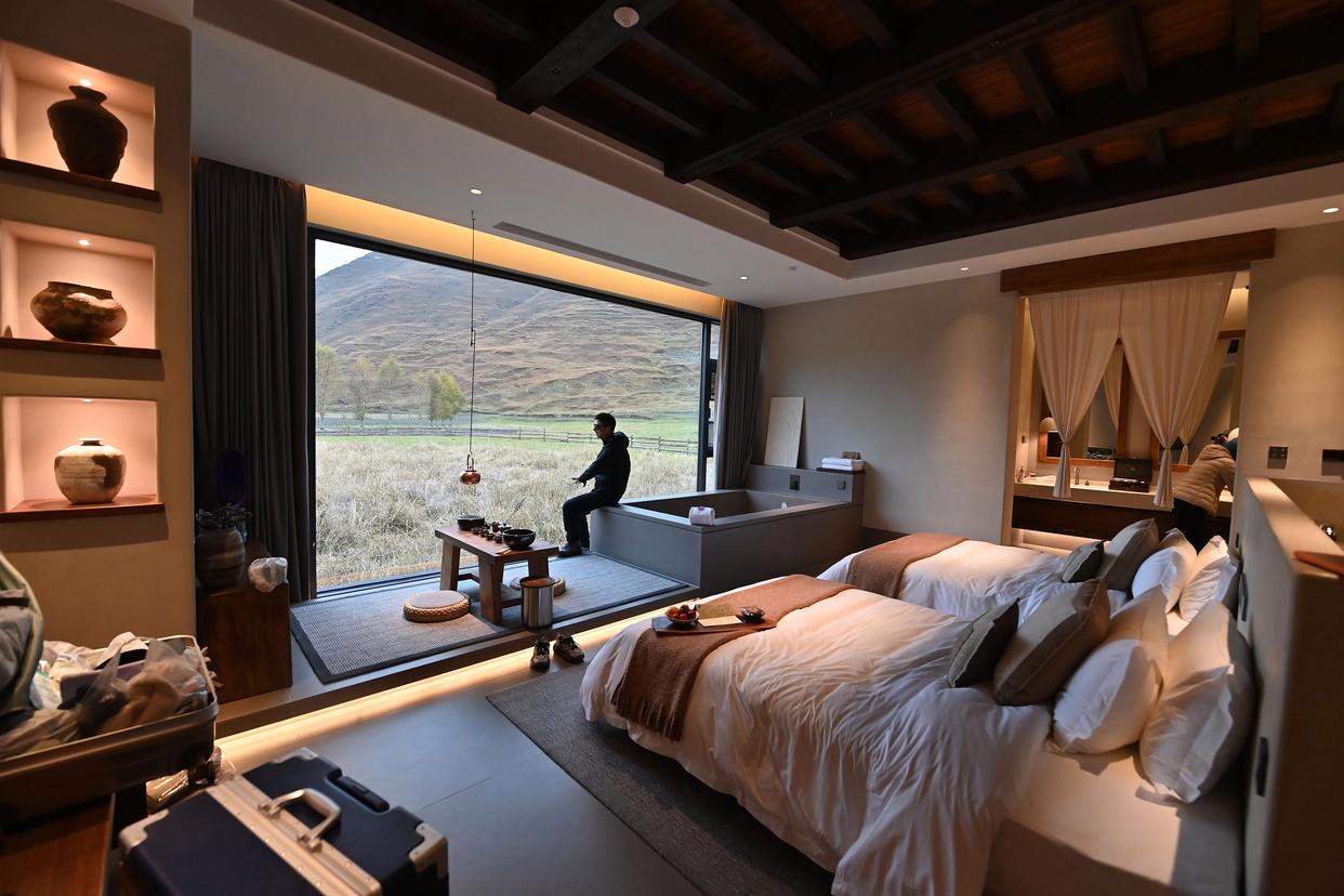 10月31日,在四川省甘孜州康定市新都桥镇,来自浙江的游客在民宿“赞巴·明境”的房间里休息。新华社记者 肖潇 摄