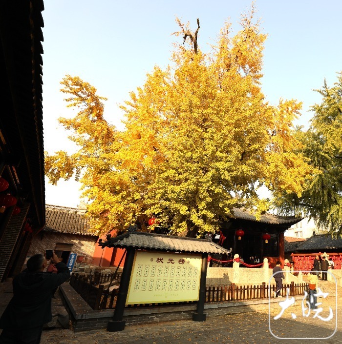 11月17日,游人在寿县古城孔庙内观赏银杏树。时下,寿县古城内11株“国宝级”银杏树树叶由绿变黄,进入最佳观赏期。