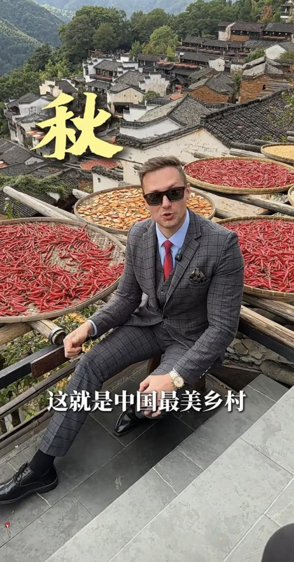 婺源篁岭的“晒秋”让外国博主@Lex在中国为之震撼,因着“地无三尺平”的山势,村民们巧妙利用屋顶、窗台架起圆圆的晒匾,将赤焰般的辣椒、金黄璀璨的谷粒等农作物晾晒在秋日明媚的阳光中。五彩的农作物与村落的粉墙黛瓦互相映衬,为秋天绘就了一幅充满喜悦的江西好“丰”景。