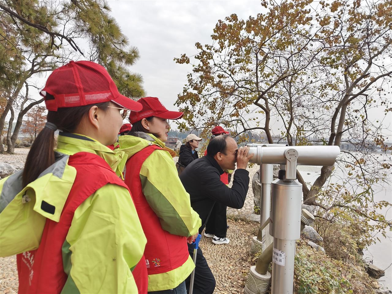 景区内游客络绎不绝,其中不乏远道而来的浙江、河北、湖南等地游客。志愿者们主动上前,热情指引最佳观鸟点位,细致讲解文明观鸟规范。“前面的观鸟台视野最好,用景区设置的专业设备能清晰看到红嘴鸥振翅、鸬鹚捕鱼和大雁振翅的模样。”志愿者张静的介绍,让游客们对即将到来的观鸟体验充满期待。