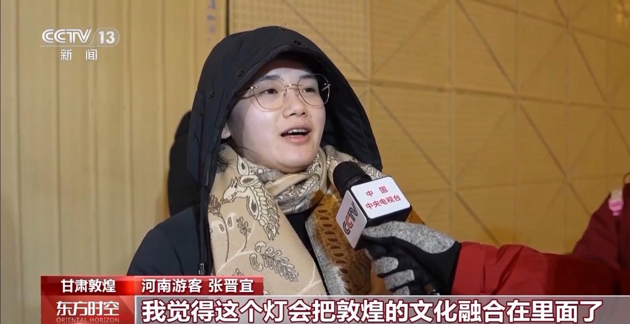 河南游客 张晋宜:组织得挺好的,我看到入口处有免费的热饮,感觉很贴心,我觉得这个灯会把敦煌的文化融合在里面了,又热闹又有文化。