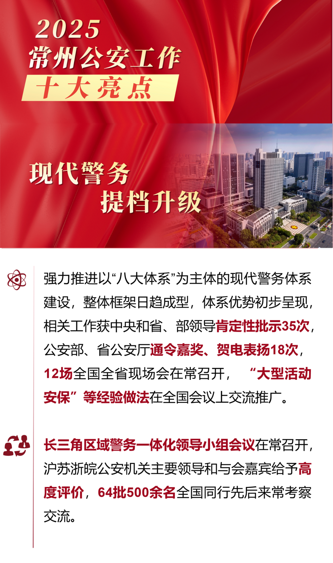 在第六个中国人民警察节来临之际,江苏省常州市公安局召开“向人民报告”主题新闻发布会,正式发布2025年全市公安工作“十大亮点”及“十项惠民实事”。过去一年,常州公安围绕便民服务、安全保障、经济发展等多方面推出系列创新举措,取得显著成效。