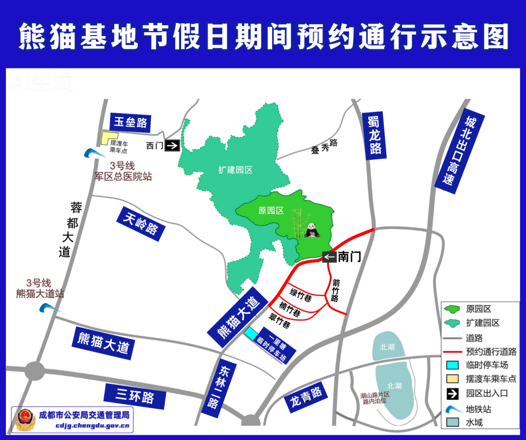 2月2日,记者从成都市公安局交管局获悉,为保障成都大熊猫繁育研究基地(以下简称“熊猫基地”)西门、南门周边道路大客流期间交通运行平稳有序,切实提升群众出行安全感、出游体验感,根据《中华人民共和国道路交通安全法》的规定,在2026年春节期间对熊猫基地周边道路实施机动车预约通行等管理措施。具体如下: