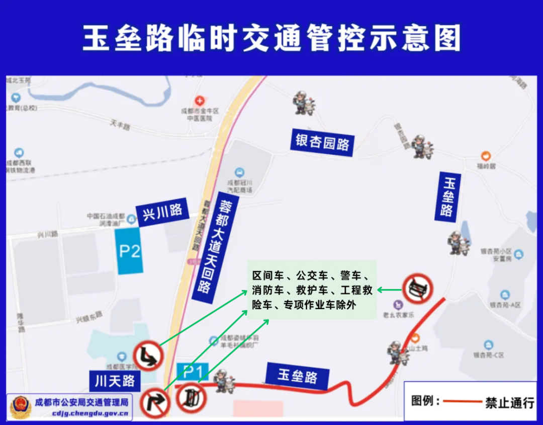 玉垒路(蓉都大道天回路至翠微路段)禁止机动车通行(区间车、公交车、警车、消防车、救护车、工程救险车、专项作业车除外)。