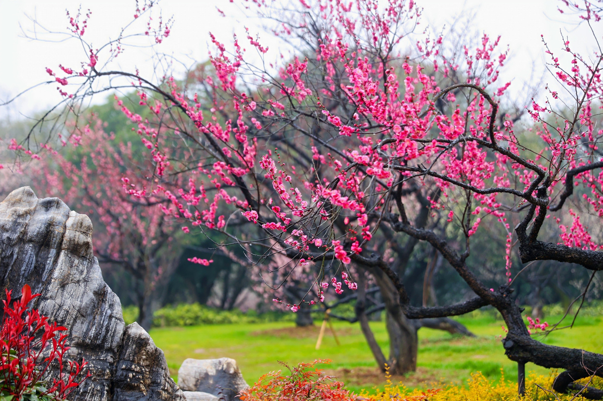 园内坐拥2万余株、360余种梅花,既有变绿萼、台阁宫粉等珍稀品种惊艳亮相,更有树龄800年的“梅祖宗”苍劲伫立,堪称活态文化瑰宝。精心打造“今古咏梅”“梅台映雪”“梅妻鹤子”等主题景点,自然景观与人文意蕴深度融合,游客可近距离赏梅姿、瞻古梅、悟文脉。